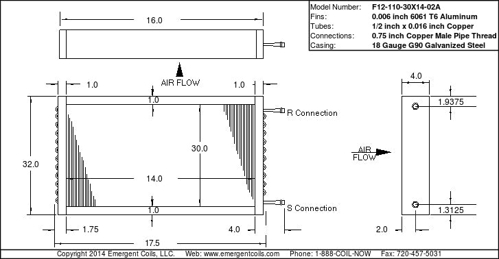 1/2 inch tube, 1 row, 10 fins per inch, 30 inches tall by 14 inches inches wide non-headered hot water booster coil with flanged casing and 0.75 inch MPT connections.