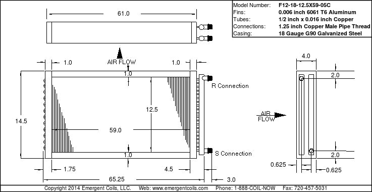 1/2 inch tube, 1 row, 8 fins per inch, 12.5 inches tall by 59 inches inches wide headered hot water booster coil with flanged casing and 1.25 inch MPT connections.