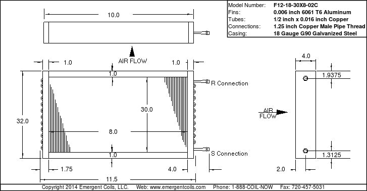 1/2 inch tube, 1 row, 8 fins per inch, 30 inches tall by 8 inches inches wide non-headered hot water booster coil with flanged casing and 1.25 inch MPT connections.